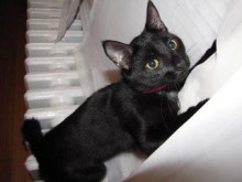 Linus is an 8 year old declawed and neutered black cat with white markings. He doesn't have a collar, tag or a chip.